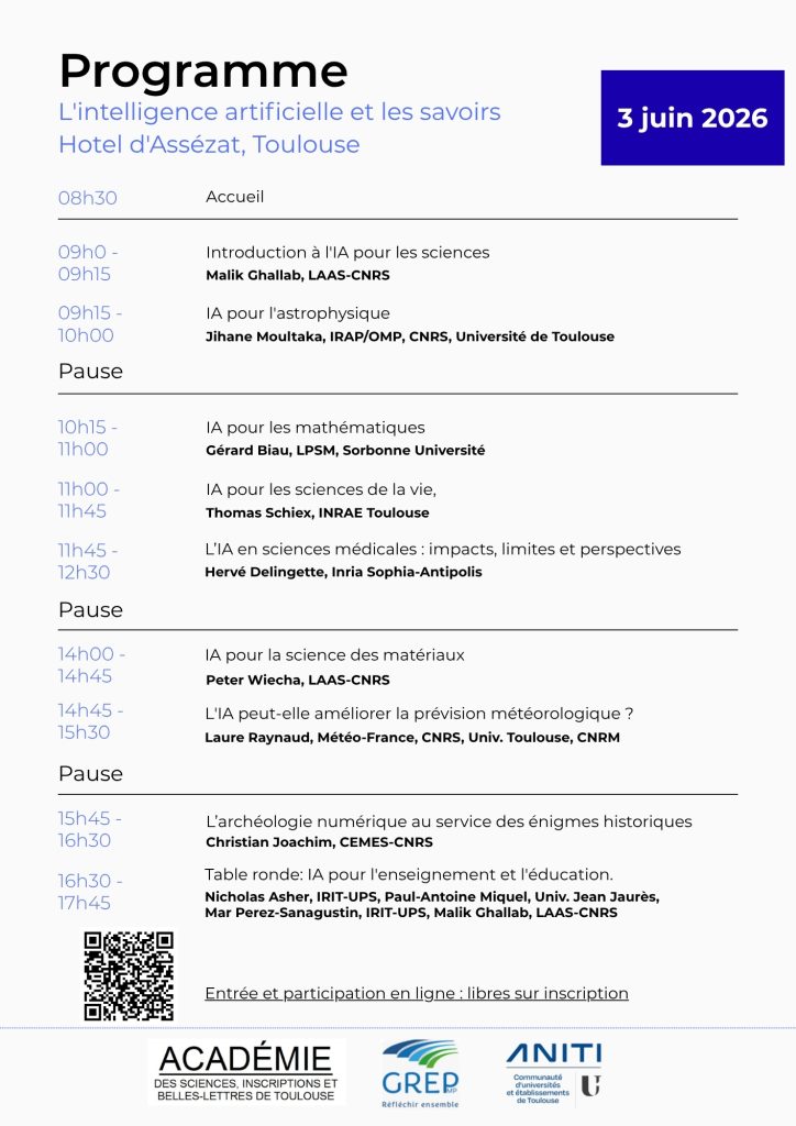 The mercredi 3 juin 2026, la salle Clémence Isaure de l’Hôtel d’Assézat accueillera cet événement dédié aux interactions entre l’intelligence artificielle et l’évolution des sciences. Co-organisé par l’Académie des Sciences, Inscriptions et Belles-Lettres de Toulouse, le GREP et ANITI, ce colloque s’adresse à un large public de personnes curieuses de science et des évolutions récentes de ses méthodes avec l’intelligence artificielle (IA).